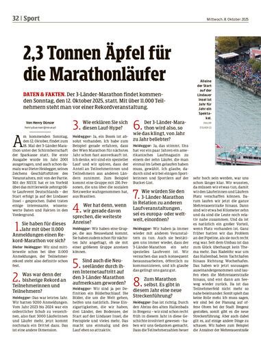 Daten & Fakten. Der 3-Länder-Marathon findet kommenden Sonntag, den 12. Oktober 2025, statt. Mit über 11.000 Teil-nehmern steht man vor einer Rekordveranstaltung.