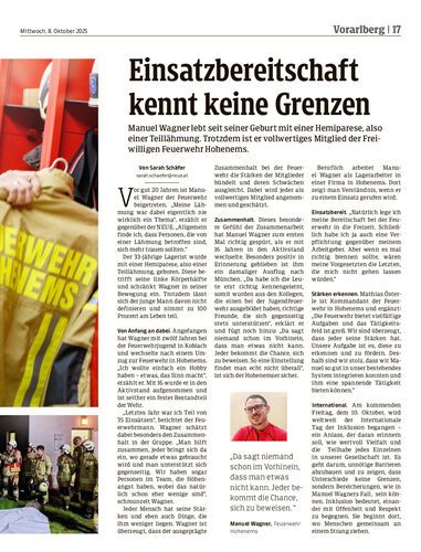 Manuel Wagner lebt seit seiner Geburt mit einer Hemiparese, also einer Teillähmung. Trotzdem ist er vollwertiges Mitglied der Freiwilligen Feuerwehr Hohenems.