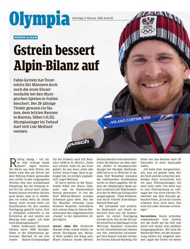 Fabio Gstrein hat Österreichs Ski-Männern doch noch die erste Einzelmedaille bei den Olympischen Spielen in Italien beschert. Der 28-jährige Tiroler gewann im Slalom, dem letzten Rennen in Bormio, Silber (+0,35). Olympiasieger im Torlauf darf sich Loic Meillard nennen.
