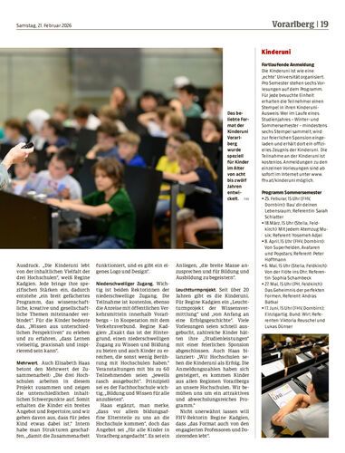 Mit dem Auftakt des Sommersemesters 2026 startet die Kinderuni Vorarlberg wieder durch. Die Hochschulen öffnen ihre Türen für Acht- bis Zwölfjährige. Alle sind zum Mitdenken, Mitmachen und Entdecken eingeladen.