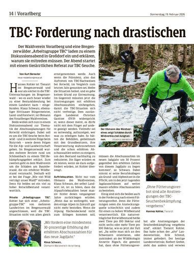 Der Waldverein Vorarlberg und eine Bregenzerwälder „Arbeitsgruppe TBC“ laden zu einem Diskussionsabend in Großdorf ein und erklären, warum sie mitreden müssen. Der Abend startet mit einem tierärztlichen Referat zur TBC-Seuche.
