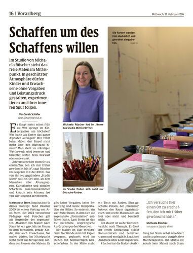 Im Studio von Michaela Rüscher steht das freie Malen im Mittelpunkt. In geschützter Atmosphäre dürfen Kinder und Erwachsene ohne Vorgaben und Leistungsdruck gestalten, experimentieren und ihrer inneren Spur folgen.