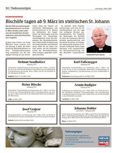 Bischöfe tagen ab 9. März im steirischen St. Johann