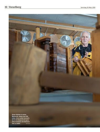 Elmar Stüttler, bekannt als Obmann von „Tischlein deck dich“, pflegt in Vandans die Tradition des Rätschen-Bauens.
