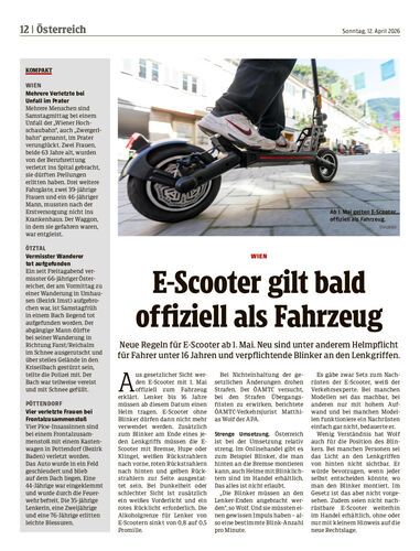 Neue Regeln für E-Scooter ab 1. Mai. Neu sind unter anderem Helmpflicht für Fahrer unter 16 Jahren und verpflichtende Blinker an den Lenkgriffen.