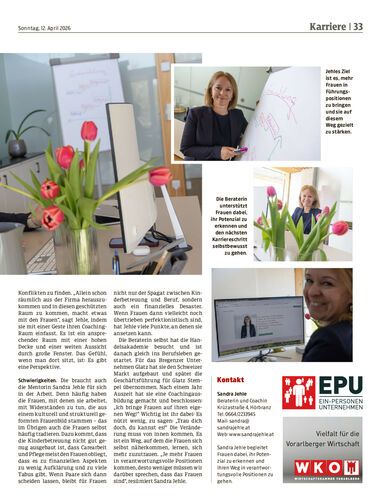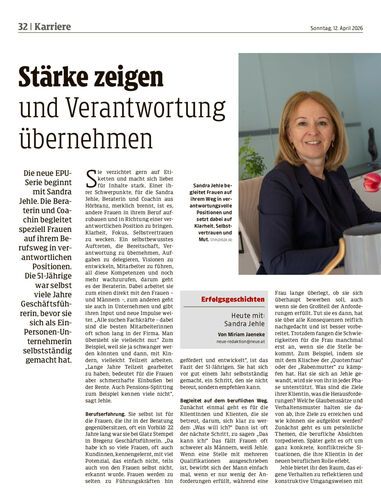 Die neue EPU-Serie beginnt mit Sandra Jehle. Die Beraterin und Coachin begleitet speziell Frauen auf ihrem Berufsweg in verantwortlichen Positionen. Die 51-Jährige war selbst viele Jahre Geschäftsführerin, bevor sie sich als Ein-Personen-Unternehmerin selbstständig gemacht hat.