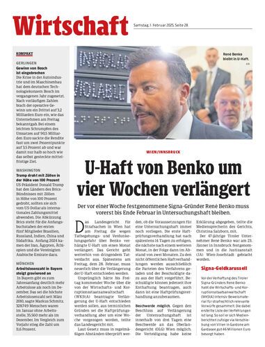 Der vor einer Woche festgenommene Signa-Gründer René Benko muss vorerst bis Ende Februar in Untersuchungshaft bleiben.