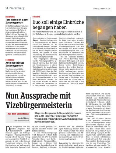 Klagende Bregenzer Kulturamtsleiterin und beklagte Bregenzer Vizebürgermeisterin wollen über ehrenrührige Äußerungen privat miteinander reden.