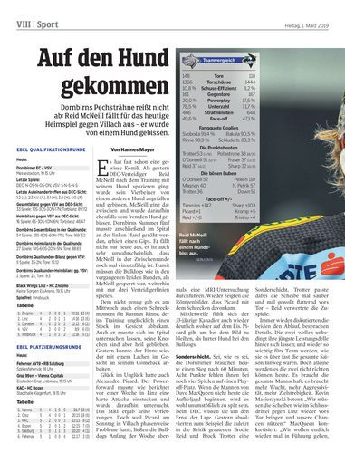 Dornbirns Pechsträhne reißt nicht ab: Reid McNeill fällt für das heutige Heimspiel gegen Villach aus – er wurde von einem Hund gebissen.