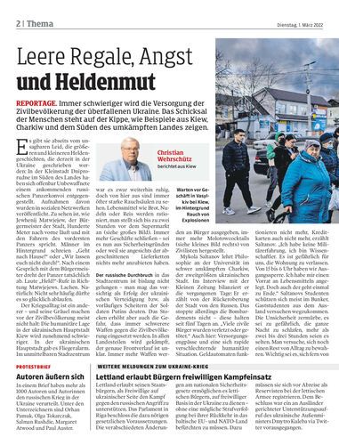 reportage. Immer schwieriger wird die Versorgung der Zivilbevölkerung der überfallenen Ukraine. Das Schicksal der Menschen steht auf der Kippe, wie Beispiele aus Kiew, Charkiw und dem Süden des umkämpften Landes zeigen.