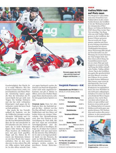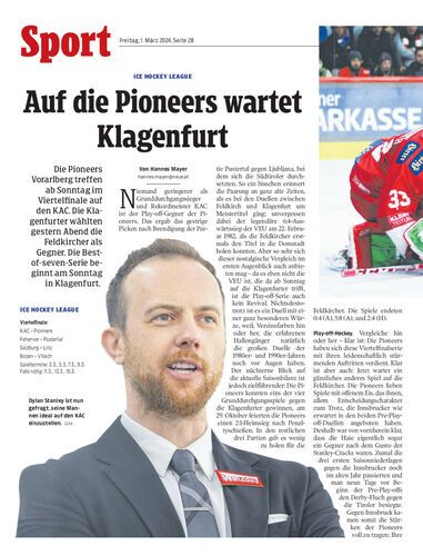Die Pioneers Vorarlberg treffen ab Sonntag im Viertelfinale auf den KAC. Die Klagenfurter wählten gestern Abend die Feldkircher als Gegner. Die Best-of-seven-Serie beginnt am Sonntag in Klagenfurt.