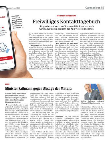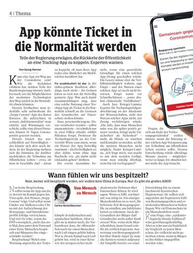 Heikle Gratwanderung. Das Rote Kreuz ermöglicht mit seiner „Stopp Corona“-App, gewarnt zu werden, wenn man Kontakt mit jemandem hatte, der positiv getestet wurde. Bis auf Weiteres freiwillig. Seiten 4/5 APA