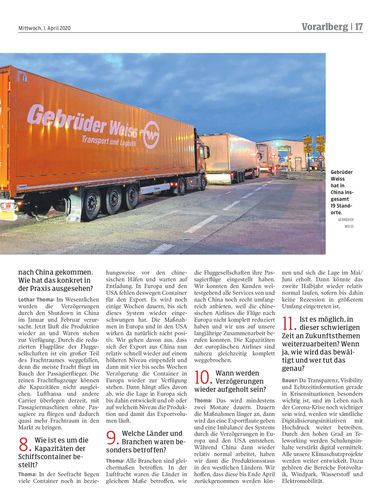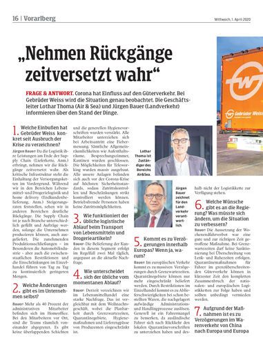 Frage & Antwort. Corona hat Einfluss auf den Güterverkehr. Bei Gebrüder Weiss wird die Situation genau beobachtet. Die Geschäftsleiter Lothar Thoma (Air & Sea) und Jürgen Bauer (Landverkehr) informieren über den Stand der Dinge.