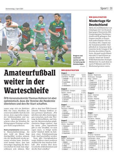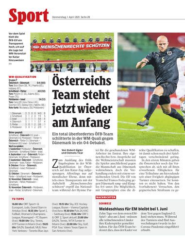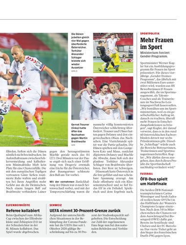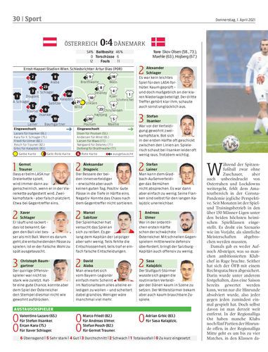 fussball. Im dritten Gruppenspiel der WM-Qualifikation wird Österreich in Wien von Dänemark auseinandergenommen. In der Tabelle rutscht das Team von Trainer Franco Foda auf den vierten Rang ab. Seiten 28/29 gepa