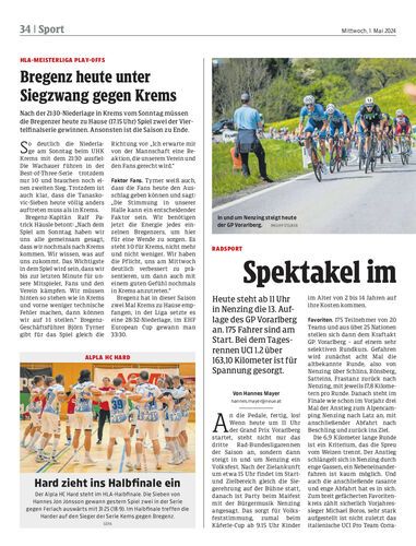 Nach der 21:30-Niederlage in Krems vom Sonntag müssen die Bregenzer heute zu Hause (17.15 Uhr) Spiel zwei der Viertelfinalserie gewinnen. Ansonsten ist die Saison zu Ende.