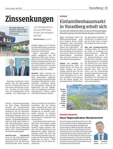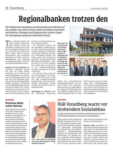 Die Volksbank Vorarlberg und die Sparkassen blicken auf ein stabiles Jahr 2024 zurück. Beide vermelden Zuwächse bei Krediten, Einlagen und Eigenmitteln, jedoch Ergebnis-Rückgänge aufgrund sinkender Zinsen.