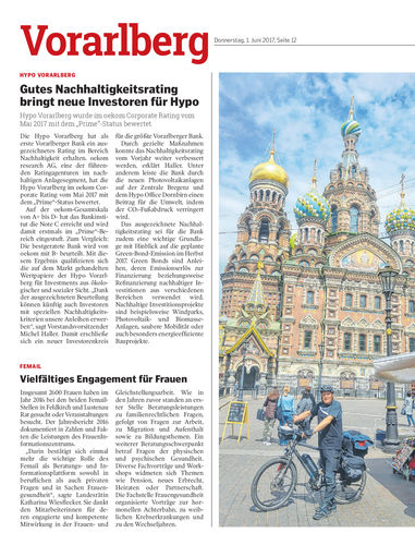 Hypo Vorarlberg wurde im oekom Corporate Rating vom Mai 2017 mit dem „Prime“-Status bewertet.