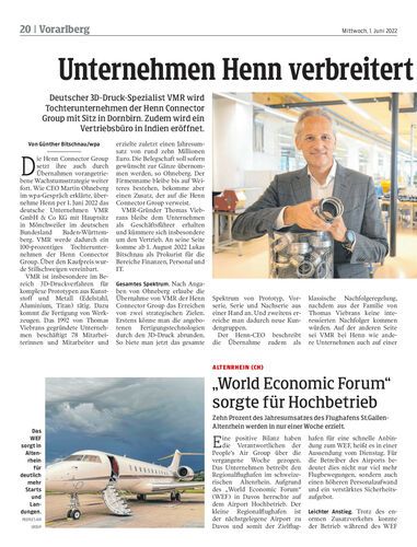 Deutscher 3D-Druck-Spezialist VMR wird Tochterunternehmen der Henn Connector Group mit Sitz in Dornbirn. Zudem wird ein Vertriebsbüro in Indien eröffnet.
