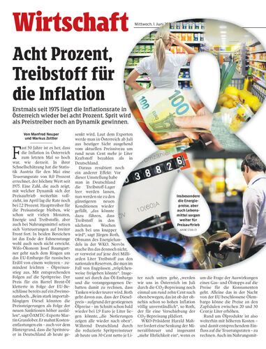 Erstmals seit 1975 liegt die Inflationsrate in Österreich wieder bei acht Prozent. Sprit wird als Preistreiber noch an Dynamik gewinnen.