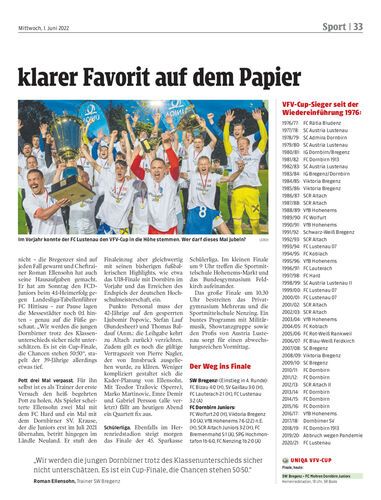 Im VFV-Cupfinale stehen sich heute Abend im Hohenemser Herrenried-Stadion (19 Uhr) Eliteligist SW Bregenz und Landesligist FC Dornbirn Juniors gegenüber.