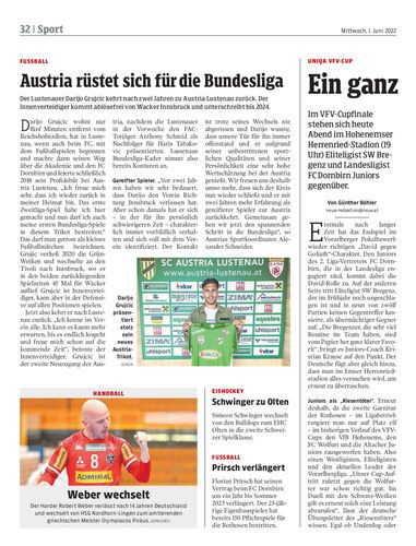 Der Lustenauer Darijo Grujcic kehrt nach zwei Jahren zu Austria Lustenau zurück. Der Innenverteidiger kommt ablösefrei von Wacker Innsbruck und unterschreibt bis 2024.