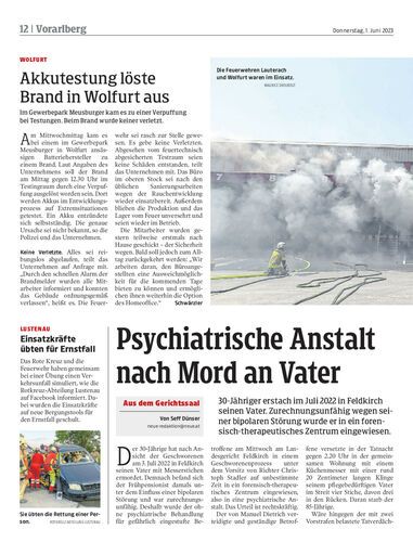 30-Jähriger erstach im Juli 2022 in Feldkirch seinen Vater. Zurechnungsunfähig wegen seiner bipolaren Störung wurde er in ein forensisch-therapeutisches Zentrum eingewiesen.