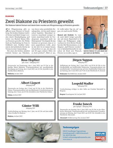 Die Diakone Gabriel Steiner und Jakob Geier wurden am Pfingstmontag zu Priestern geweiht.