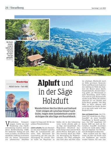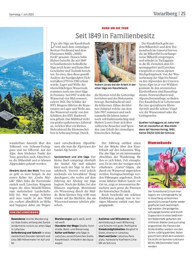 Wanderführer Hertha Glück und Gerhard Vylet steigen ab Latschau hinauf nach Grabs, folgen dem Sanüelerbach und besichtigen die alte Säge am Rasafeibach.