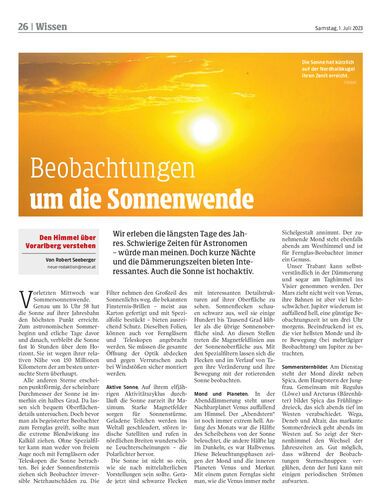 Wir erleben die längsten Tage des Jahres. Schwierige Zeiten für Astronomen – würde man meinen. Doch kurze Nächte und die Dämmerungszeiten bieten Interessantes. Auch die Sonne ist hochaktiv.