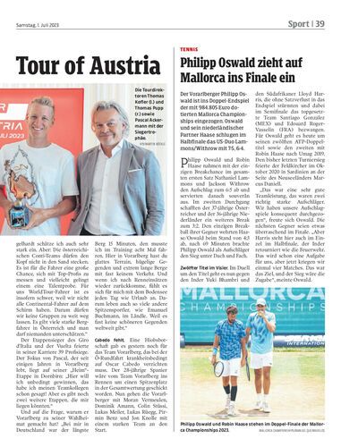 Der Vorarlberger Philipp Oswald ist ins Doppel-Endspiel der mit 984.805 Euro dotierten Mallorca Championships eingezogen. Oswald und sein niederländischer Partner Haase schlugen im Halbfinale das US-Duo Lammons/Withrow mit 7:5, 6:4.