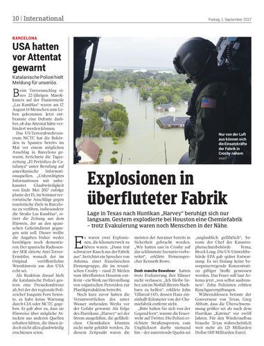 Lage in Texas nach Hurrikan „Harvey“ beruhigt sich nur langsam. Gestern explodierte bei Houston eine Chemiefabrik – trotz Evakuierung waren noch Menschen in der Nähe.
