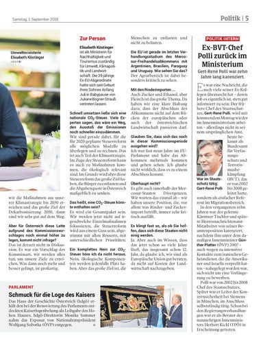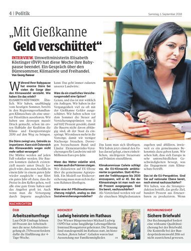 Umweltministerin Elisabeth Köstinger (ÖVP) hat diese Woche ihre Babypause beendet. Ein Gespräch über den Dürresommer, Klimaziele und Freihandel. Von Georg Renner
