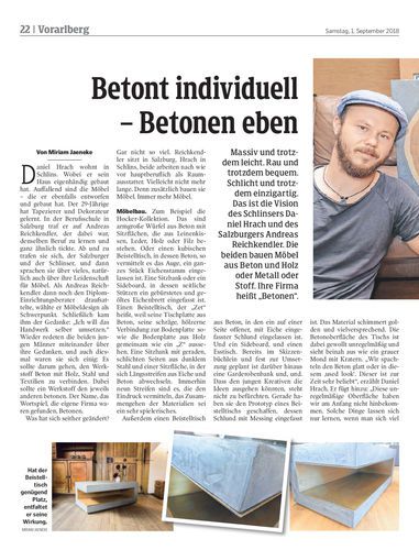 Massiv und trotzdem leicht. Rau und trotzdem bequem. Schlicht und trotzdem einzigartig. Das ist die Vision des Schlinsers Daniel Hrach und des Salzburgers Andreas Reichkendler. Die beiden bauen Möbel aus Beton und Holz oder Metall oder Stoff. Ihre Firma heißt „Betonen“.