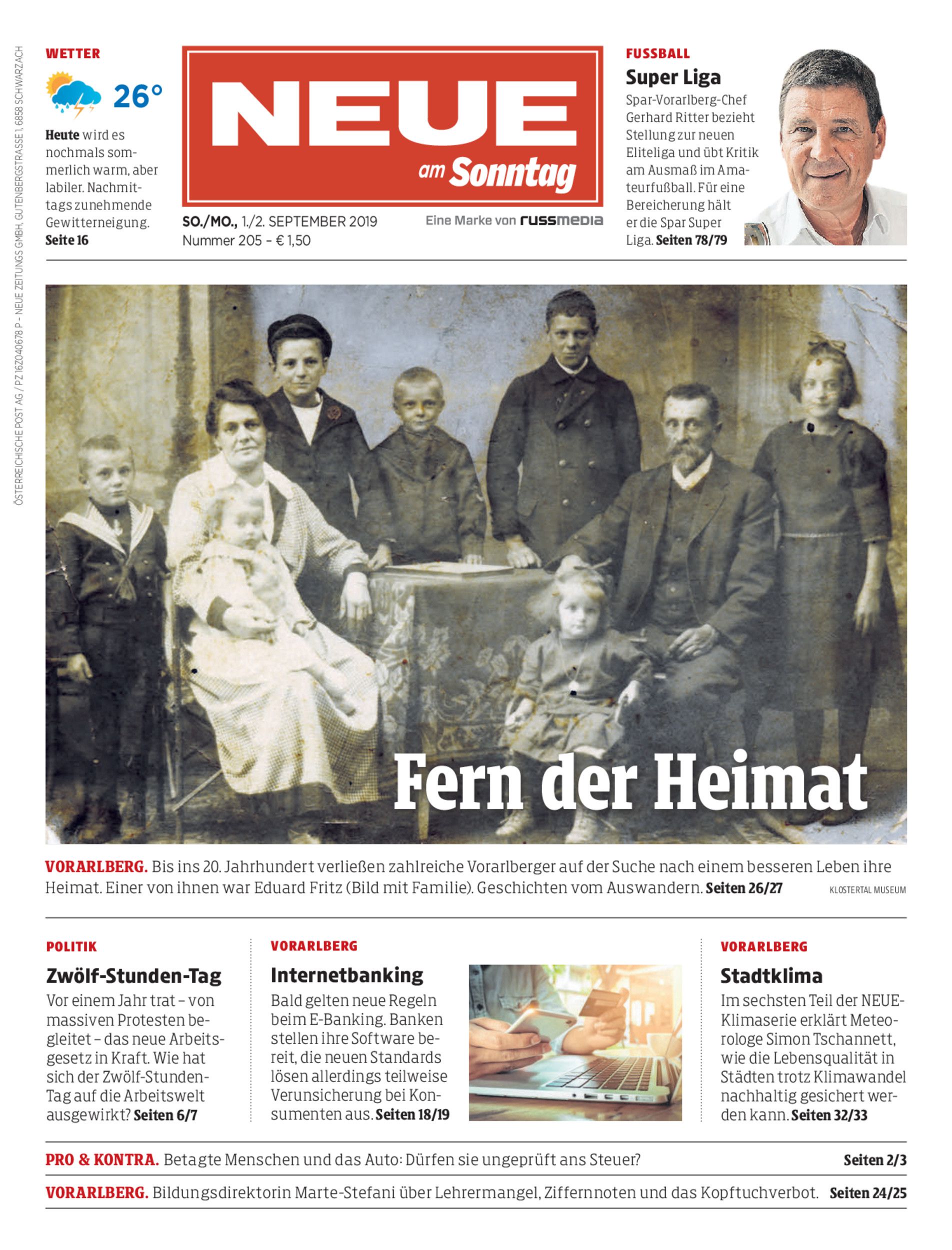 Vorarlberg. Bis ins 20. Jahrhundert verließen zahlreiche Vorarlberger auf der Suche nach einem besseren Leben ihre Heimat. Einer von ihnen war Eduard Fritz (Bild mit Familie). Geschichten vom Auswandern. Seiten 26/27 Klostertal Museum