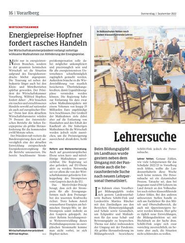 Der Wirtschaftskammerpräsident verlangt sofortige wirksame Maßnahmen zur Abfederung der Energiepreise.