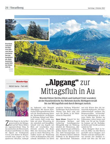 Wanderführer Hertha Glück und Gerhard Vylet wandern ab der Kuratienkirche Au-Rehmen durchs Berbigenvorsäß bis zur Mittagsfluh und durch Berngat zurück.
