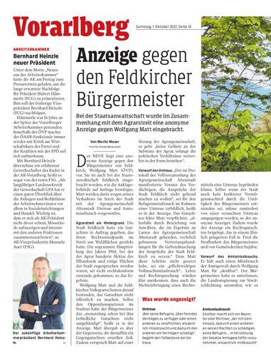 Bei der Staatsanwaltschaft wurde im Zusammenhang mit dem Agrarstreit eine anonyme Anzeige gegen Wolfgang Matt eingebracht.