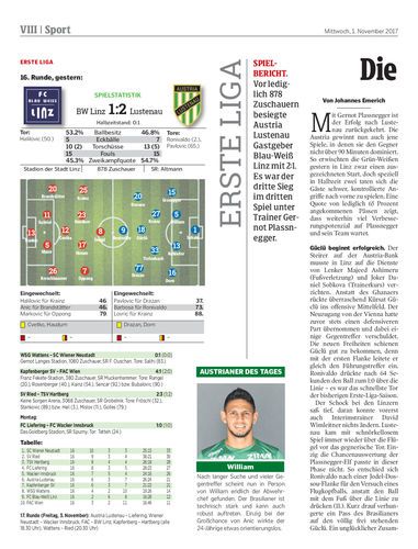 Spielbericht. Vor lediglich 878 Zuschauern besiegte Austria Lustenau Gastgeber Blau-Weiß Linz mit 2:1. Es war der dritte Sieg im dritten Spiel unter Trainer Gernot Plassnegger.