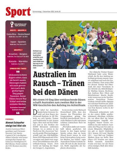 Mit einem 1:0-Sieg über enttäuschende Dänen schafft Australien zum zweiten Mal in der WM-Geschichte den Aufstieg ins Achtelfinale.