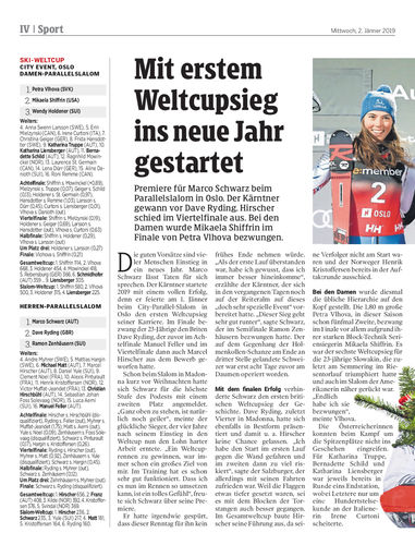 Premiere für Marco Schwarz beim Parallelslalom in Oslo. Der Kärntner gewann vor Dave Ryding. Hirscher schied im Viertelfinale aus. Bei den Damen wurde Mikaela Shiffrin im Finale von Petra Vlhova bezwungen.