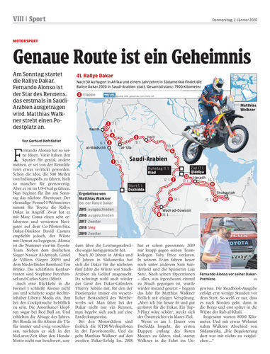 Am Sonntag startet die Rallye Dakar. Fernando Alonso ist der Star des Rennens, das erstmals in Saudi-Arabien ausgetragen wird. Matthias Walkner strebt einen Podestplatz an.