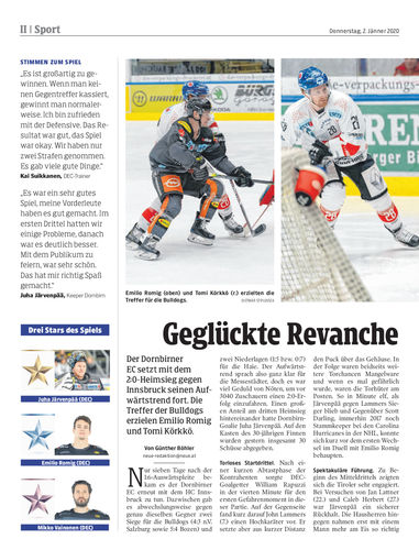 Der Dornbirner EC setzt mit dem 2:0-Heimsieg gegen Innsbruck seinen Aufwärtstrend fort. Die Treffer der Bulldogs erzielen Emilio Romig und Tomi Körkkö.