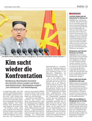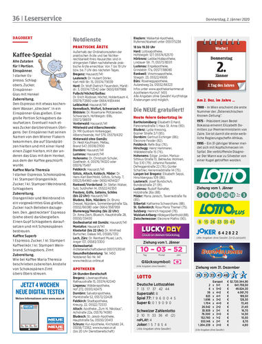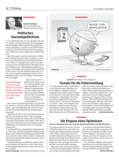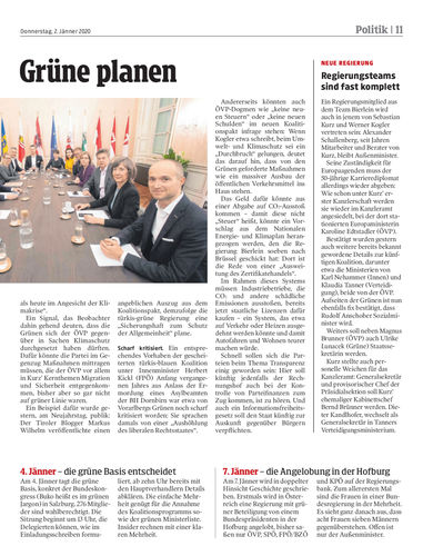 NEUe regierung. Die Koalitionsverhandlungen sind am Neujahrstag zu Ende gegangen. Auch die Namen für die Ministerposten sind mittlerweile fix. Ihr Regierungsprogramm wollen Kurz und Kogler heute präsentieren. Seiten 10/11 REUTERS