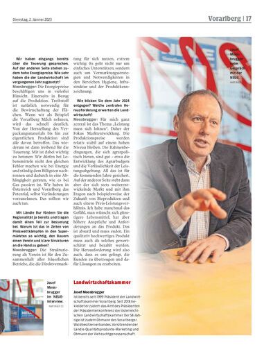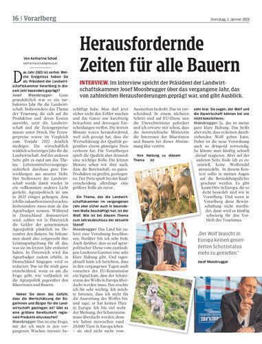 Interview. Im Interview spricht der Präsident der Landwirtschaftskammer Josef Moosbrugger über das vergangene Jahr, das von zahlreichen Herausforderungen geprägt war, und gibt Ausblick.