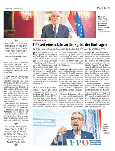 Die FPÖ erzielte bei Sonntagsfragen 2023 durchschnittlich 28 Prozent, die SPÖ 23, die ÖVP 21.