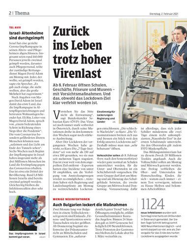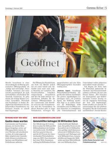 Öffnungsschritte. Ab 8. Februar gibt es in Österreich leichte Öffnungsschritte. Demnach gibt es in den Schulen wieder Präsenzunterricht, und der Handel sowie körpernahe Dienstleister dürfen öffnen. Seiten 2–5, 14/15 Hartinger