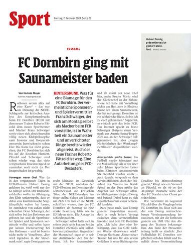 Hintergrund. Was für eine Blamage für den FC Dornbirn. Der vermeintliche Sponsoren- und Spielervermittler Franz Schwaiger, der sich am Montag selbst als Macher beim FCD vorstellte, ist in Wahrheit ein Saunameister und unverrichteter Dinge bereits wieder abgereist. Auch der neue Trainer Roberto Pätzold ist weg. Eine Aufarbeitung des FCD-Desasters.