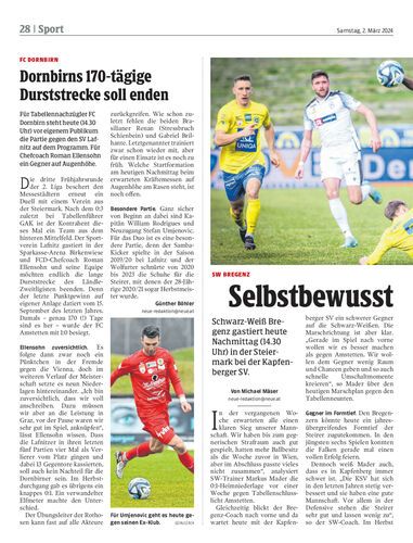 Für Tabellennachzügler FC Dornbirn steht heute (14.30 Uhr) vor eigenem Publikum die Partie gegen den SV Lafnitz auf dem Programm. Für Chefcoach Roman Ellensohn ein Gegner auf Augenhöhe.
