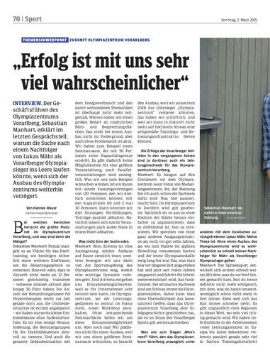 Interview. Der Geschäftsführer des Olympiazentrums Vorarlberg, Sebastian Manhart, erklärt im letzten Gesprächsteil, warum die Suche nach einem Nachfolger von Lukas Mähr als Vorarlberger Olympiasieger ins Leere laufen könnte, wenn sich der Ausbau des Olympiazentrums weiterhin verzögert.