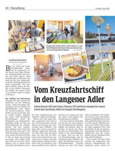 Celine Ruech (23) und Lukas Theune (27) eröffnen morgen ihr neues Lokal: das Gasthaus Adler in Langen bei Bregenz.